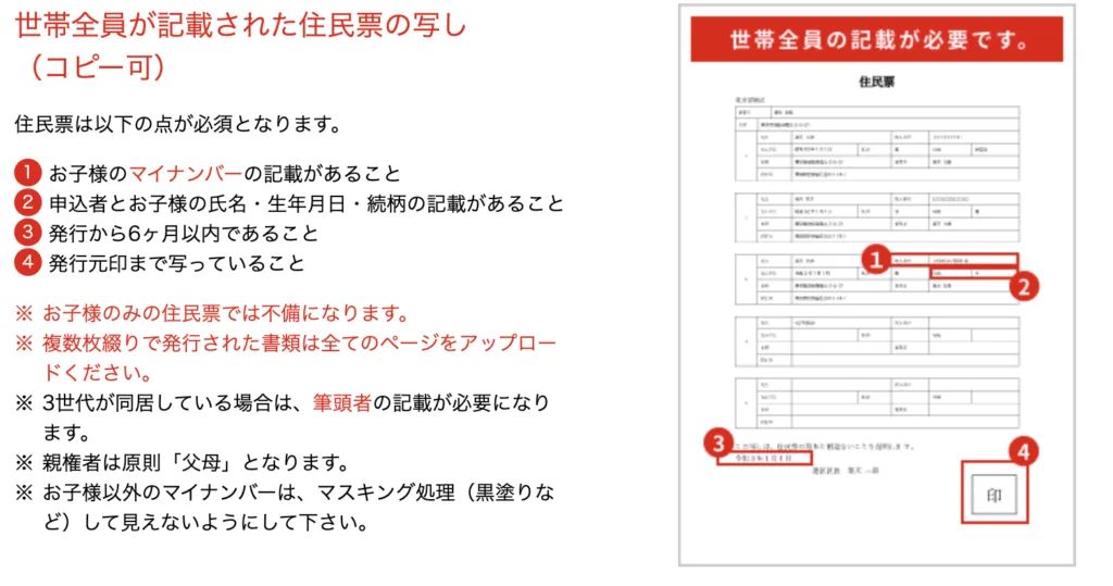 市区町村で発行される住民票には、必ず親子関係が記載されていることを確認してください。これがない場合、追加の証明書類が必要になります。